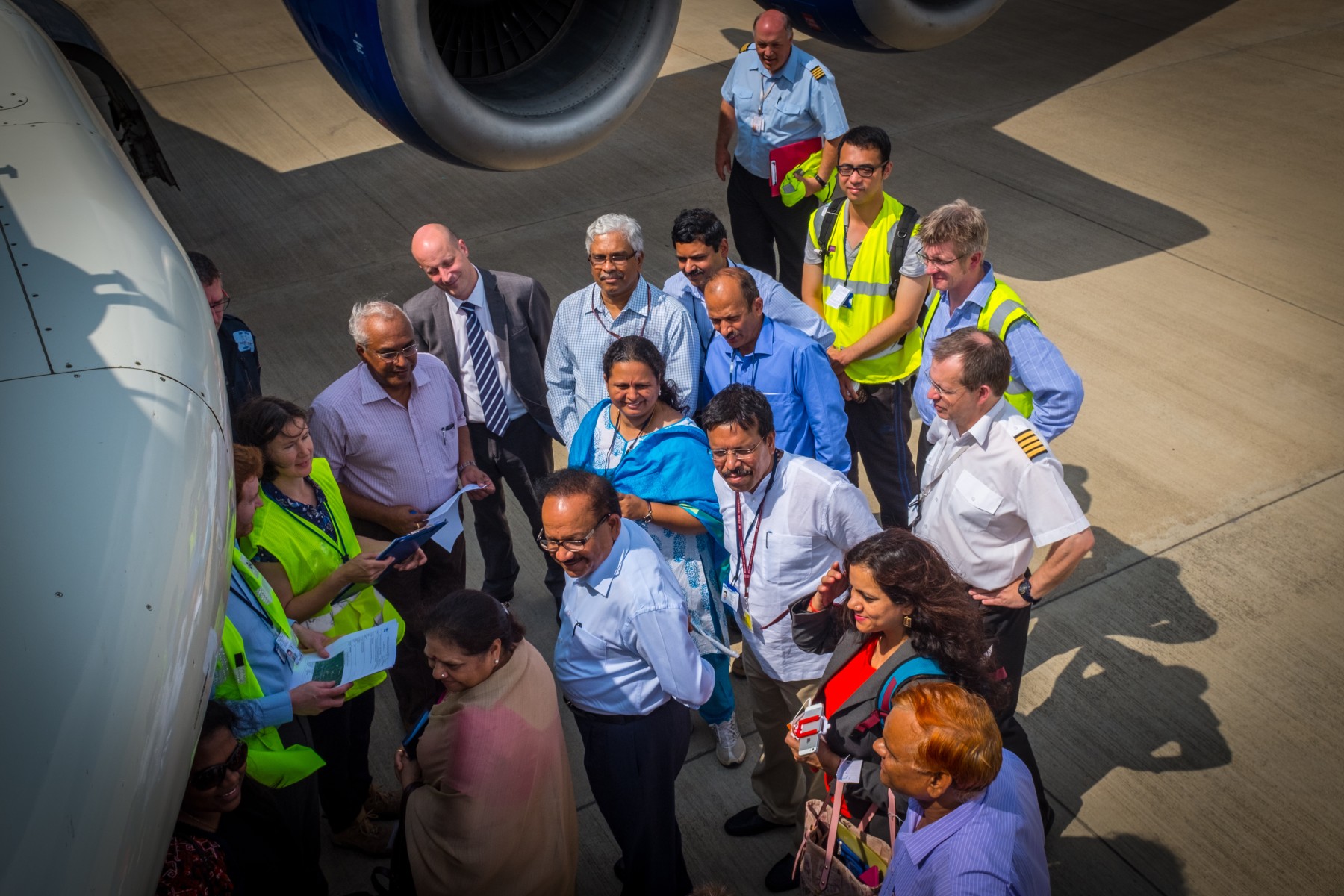 Dignitaries, including the Minister of Earth Sciences, the Secretary of Ministry of Earth Sciences, and the British Deputy High Commissioner, have a tour of the FAAM aircraft while at Lucknow airport during the INCOMPASS/SWAAMI field campaigns in 2016. Image credit Steve Devereau.