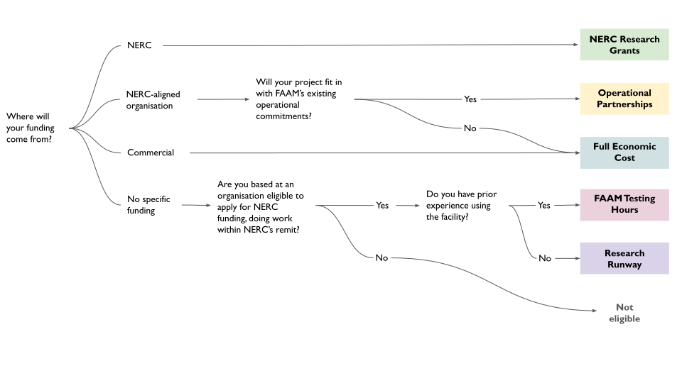 A decision tree showing the likely access routes a FAAM user could use given their research remit, funding source, experience, and type of project. This is a rough guide only, please get in touch to discuss your particular situation.