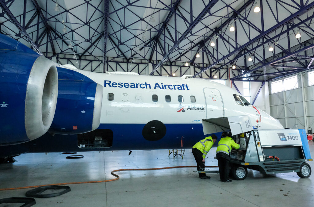 Two people wearing hi vis jacket bend over looking inside a metal unit on wheels, beside a blue and white aircraft by Harriett Richardson | Mar 27, 2023